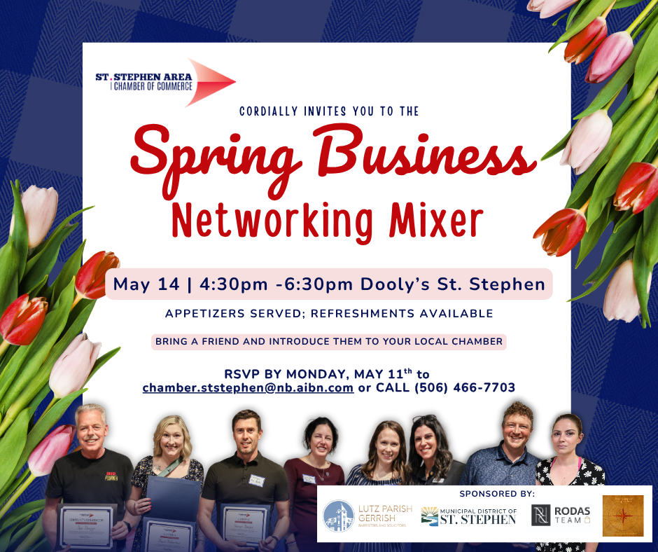 There is no cost to attend BUT registration is REQUIRED by emailing chamber.ststephen@nb.aibn.com or call (506) 466-7703, please bring a guest to introduce them to our Chamber.